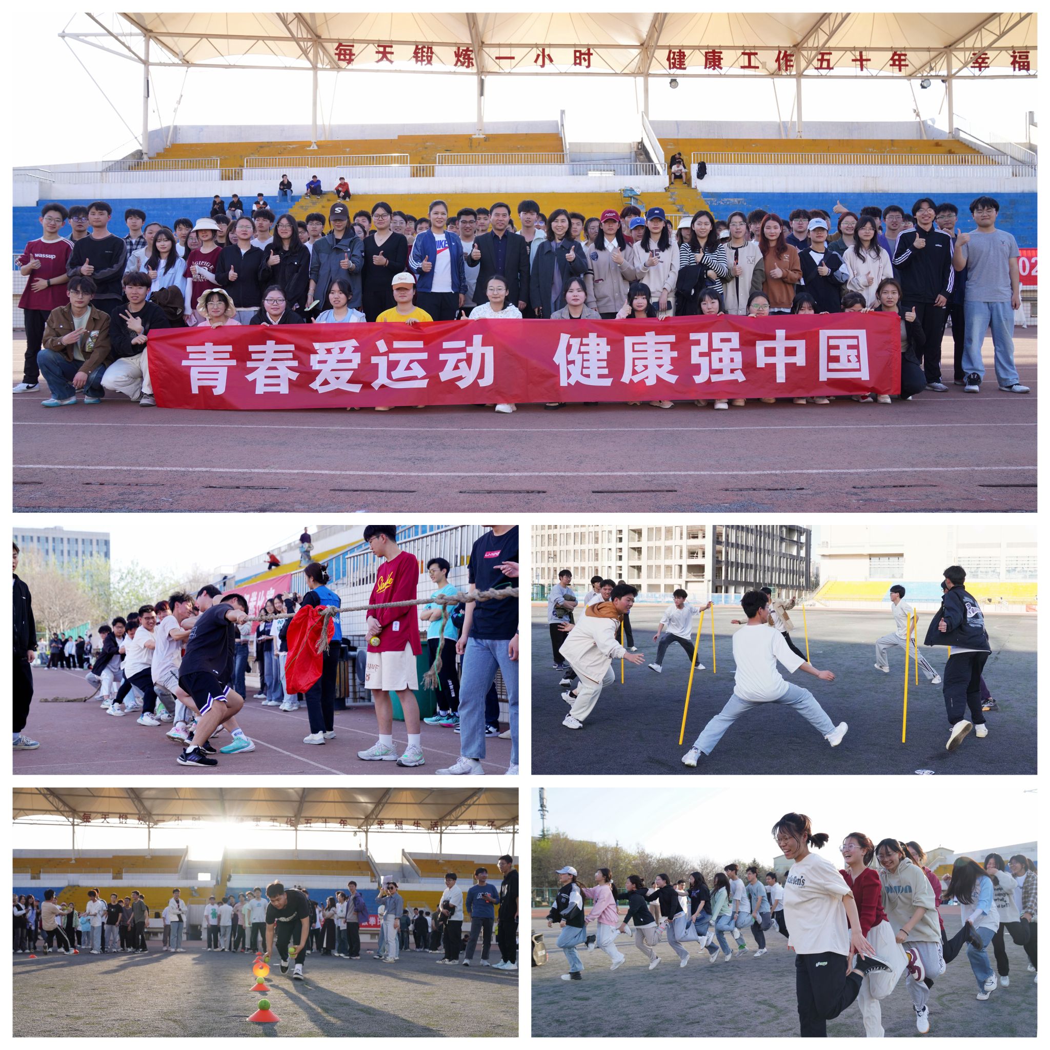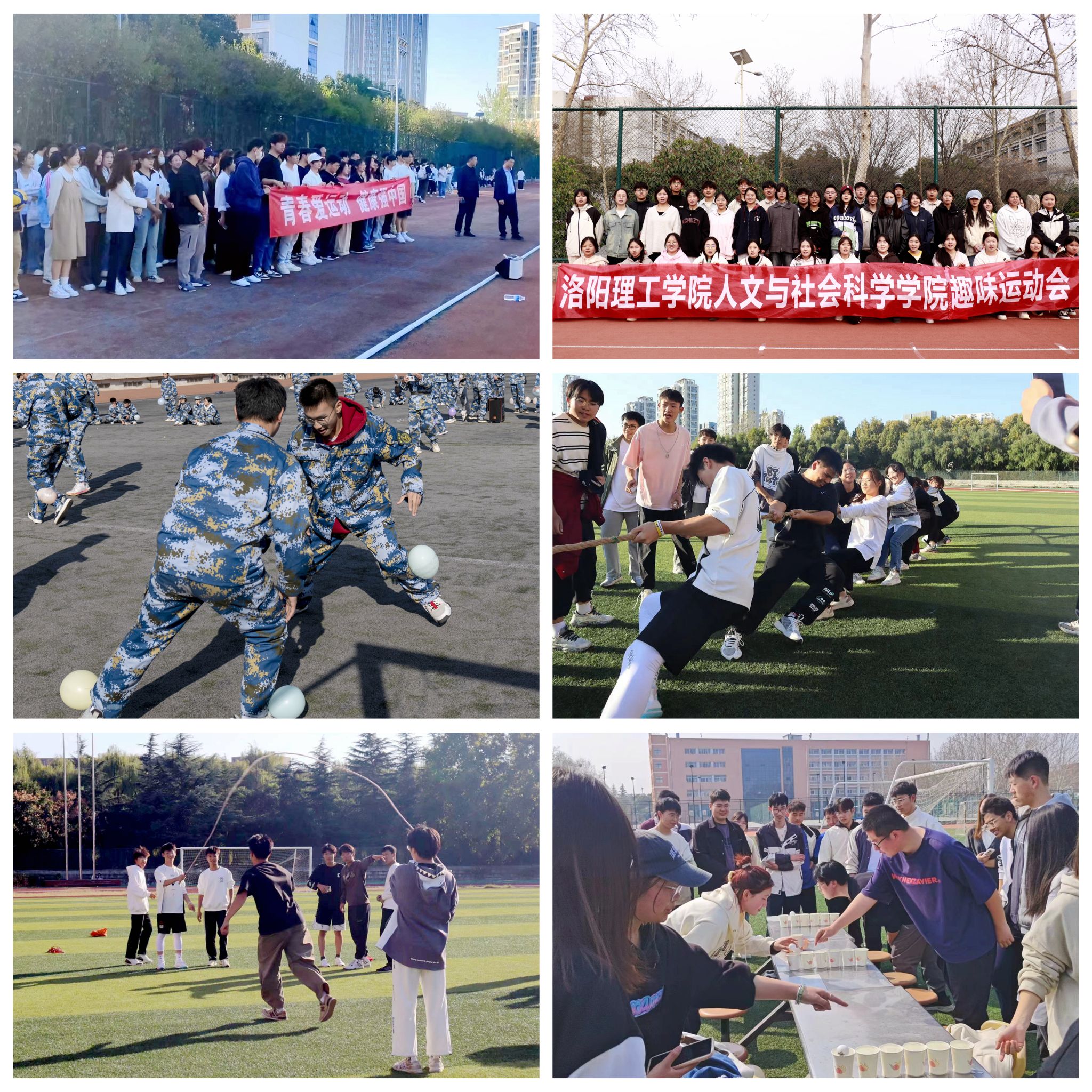 为丰富校园文化生活,增强学生身体素质,引导同学们积极参与体育活动,增强团队精神和集体向心力,展现奋发向上、勇于拼搏的当代大学生精神风貌,营造充满活力的校园氛围,3月4日至29日期间,学生工作处、校团委主办,校学生会、国旗护卫队承办了“青春爱运动 健康强中国”2024年春季趣味运动会系列活动。活动包含拔河、抢种抢收、不倒森林等近20余个趣味项目和“荧光夜跑”主题活动,累计参与学生8000余人。同学们以汗水和激情为笔,努力拼搏,书写了一段健康向上、青春洋溢的篇章。