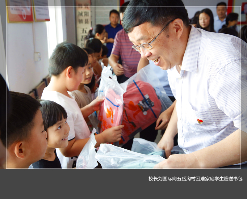 在定点扶贫村宜阳县韩城镇五岳沟村开展“情暖童心 相伴成长”金秋助学活动,校长刘国际、副校长张文选、宜阳县副县长赵珂、韩城镇党委书记王国杰,美高梅娱乐场
