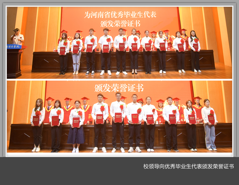 仪式上,校领导分别向优秀毕业生代表颁发荣誉证书,向毕业生代表颁发毕业证书,为本科毕业生代表扶正流苏并向他们颁发学位证书。
