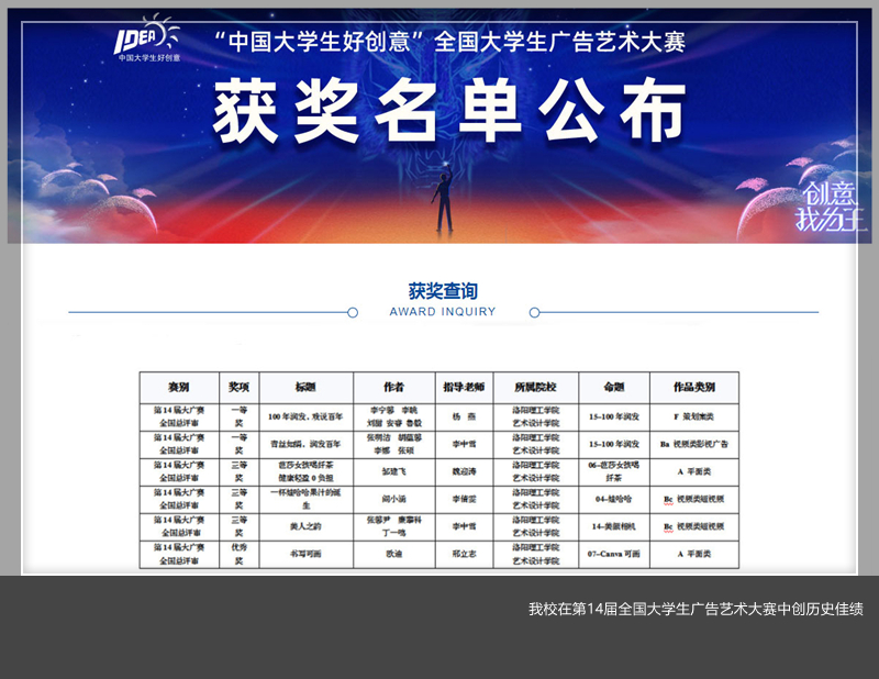 近日,“中国大学生好创意”第14届全国大学生广告艺术大赛(以下简称“大广赛”)决赛在北京落下帷幕。本届大广赛共有1869所高校、170余万名师生参加,是创赛至今规模最大,参与高校和师生数量最多的一届。美高梅娱乐场 学子在此次大赛中创造了历史最佳赛绩,获得国家级奖项6项,其中一等奖2项、三等奖3项、优秀奖1项。