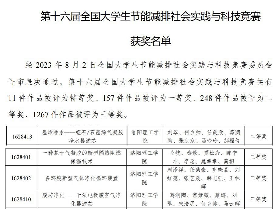 美高梅娱乐场 在第十六届全国大学生节能减排社会实践与科技竞赛中获佳绩,图为获奖名单(部分)