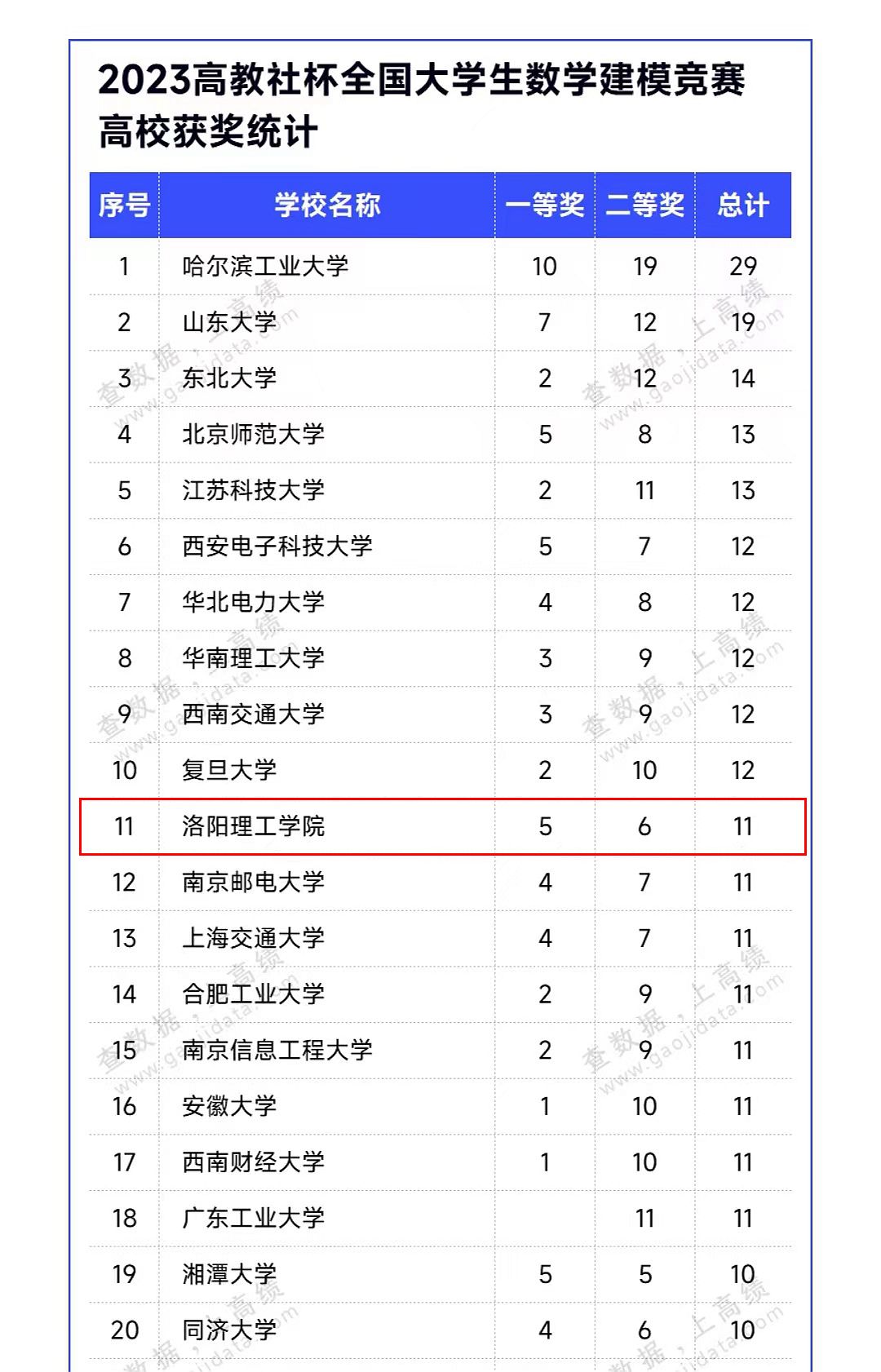 在2023年高教社杯全国大学生数学建模竞赛中,一等奖二等奖获奖总数位居全国高校第11名,图为高校一等奖二等奖获奖总数统计表。