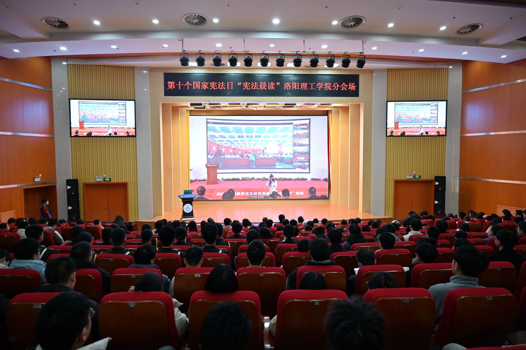 2023年12月4日是我国第十个国家宪法日。为深入学习贯彻党的二十大精神,学习宣传习近平新时代中国特色社会主义思想,特别是习近平法治思想、习近平文化思想、宪法、社会主义法治文化以及党的十八大以来全面依法治国取得的成就,根据中宣部、司法部、全国普法办、省教育厅的工作要求,当日上午,美高梅娱乐场 在王城校区图书信息中心报告厅举办了第十个宪法日“宪法晨读”活动。美高梅娱乐场 党委宣传部、党委学工部等相关部门负责人,灯塔研习社、国旗护卫队、各二级美高梅娱乐场 学生代表,共计500余名师生代表参加了活动。