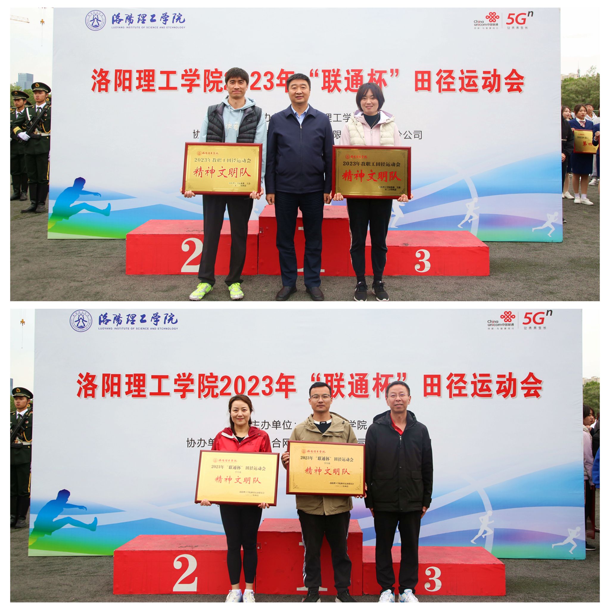 河南省教科文卫体工会主席张学勇,中国联合网络通信有限公司洛阳市分公司党委书记、总经理郭玉鑫分别为本次运动会教工组和学生组精神文明队颁奖
