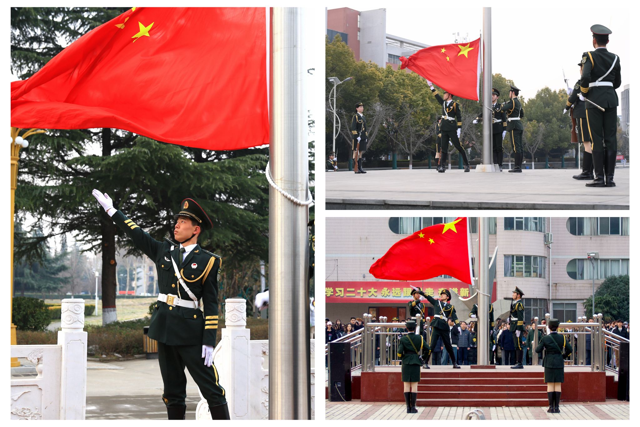 国旗护卫队在三个校区升国旗仪式现场将鲜艳的五星红旗抛向空中。