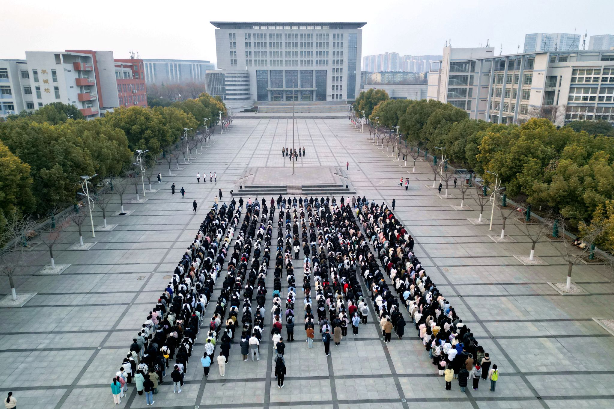 举行新学期升国旗仪式,图为王城校区仪式现场航拍图。
