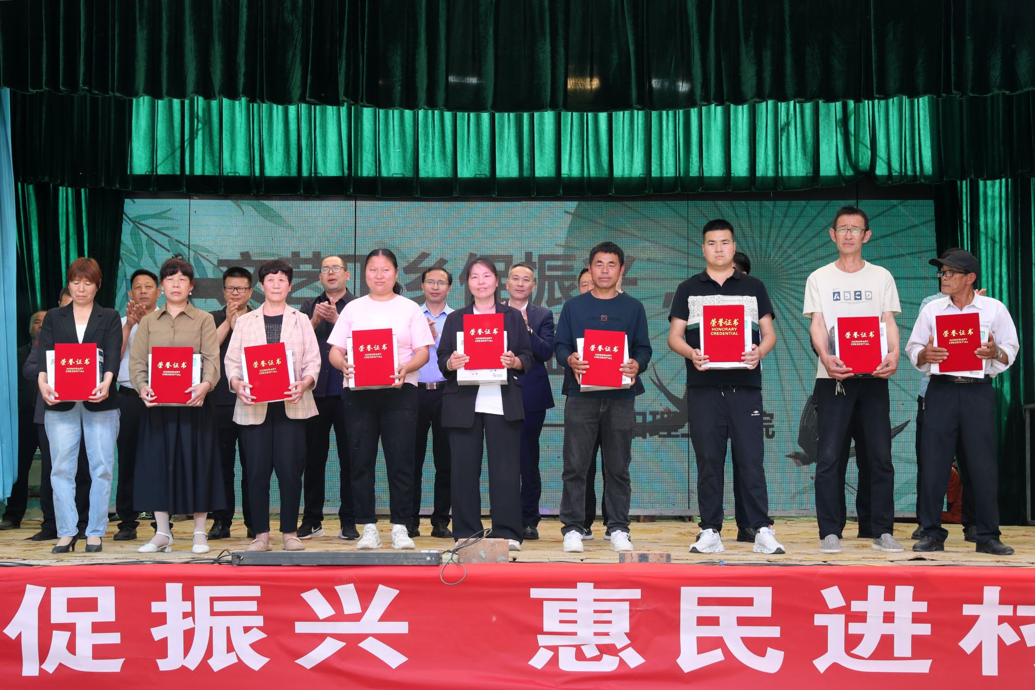 表彰会上,教育科学与音乐美高梅娱乐场 60余名师生开展了“文艺下乡促振兴 惠民进村送温暖”文艺演出,器乐合奏《象王行》、男女声合唱《阳光路上》、舞蹈《我们都是追梦人》等10余个精彩纷呈的节目,巧妙地将传统艺术与现代元素相结合,为现场观众呈现了一场精彩缤纷的艺术盛宴,赢得了在场观众的阵阵赞叹和掌声,充分展示了美高梅娱乐场 师生的专业素养和青春活力。