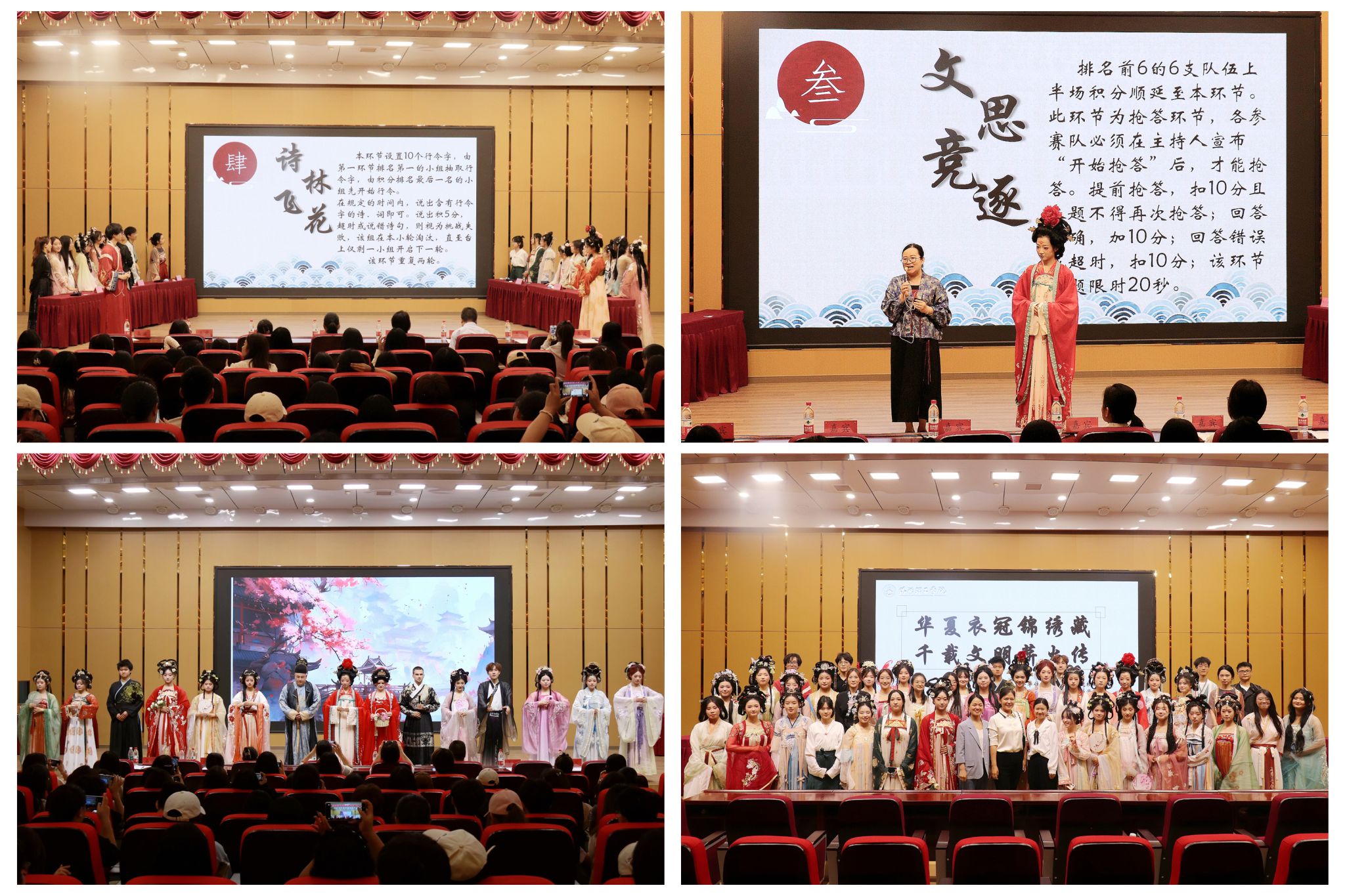 翠袖红裙、宽袍广袖、青衫白褂,学生们身着各式汉服或撑一把油纸伞、或手持团扇,在校园大道、图书馆、大明渠等处翩然走过,成为校园一道独特的风景,吸引了大批师生驻足观看。由华章汉服社和三位外教老师共同表演的《江上清风游》汉服展示拉开了活动序幕,在缓缓乐声和翩翩衣袂中,我们感受到了那份中华文化中独有的古朴典雅、飘逸灵动。此次比赛共分为“智海争渡”“火眼金睛”“文思竞逐”“诗林飞花”四个环节,通过累积积分决出一、二、三等奖。