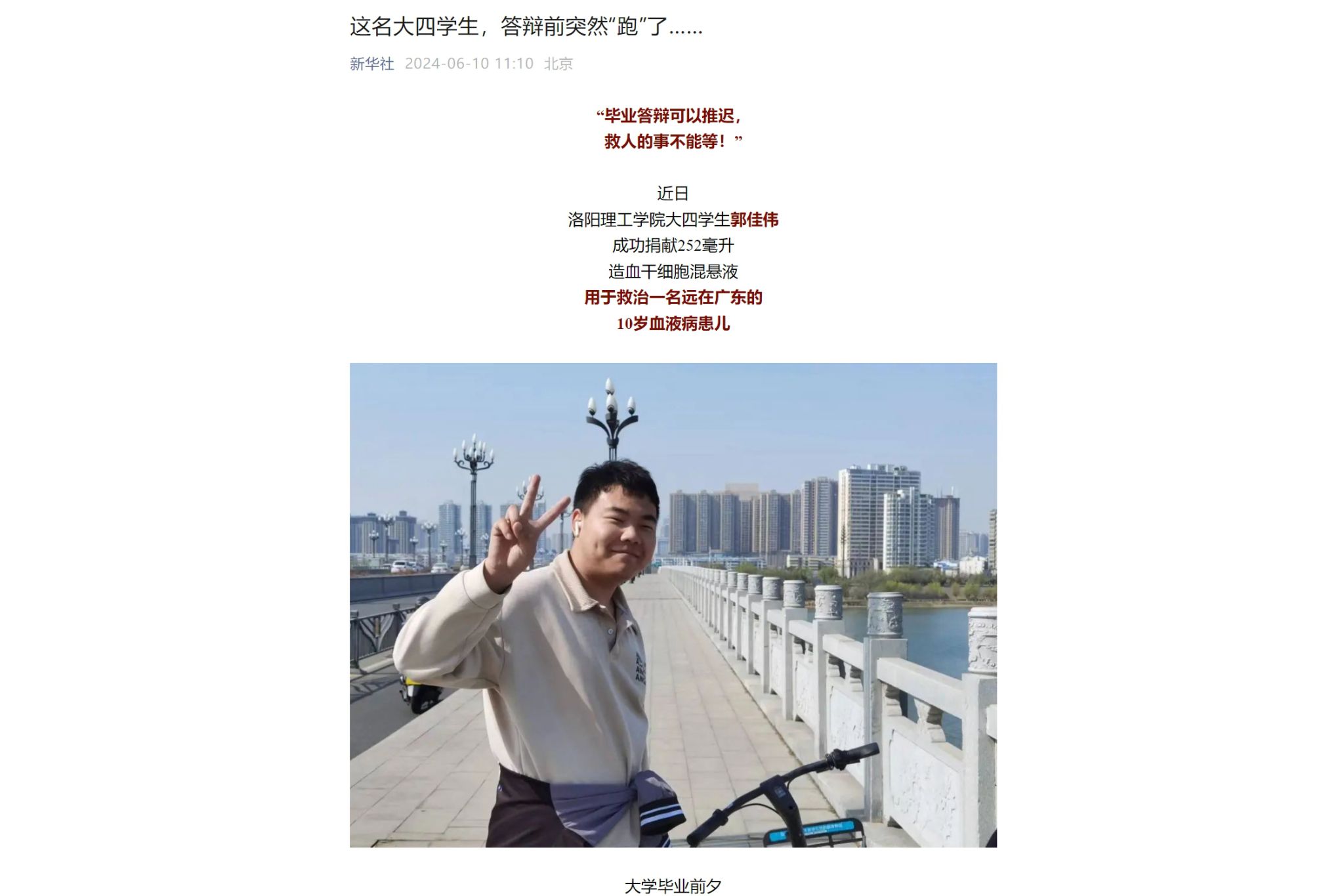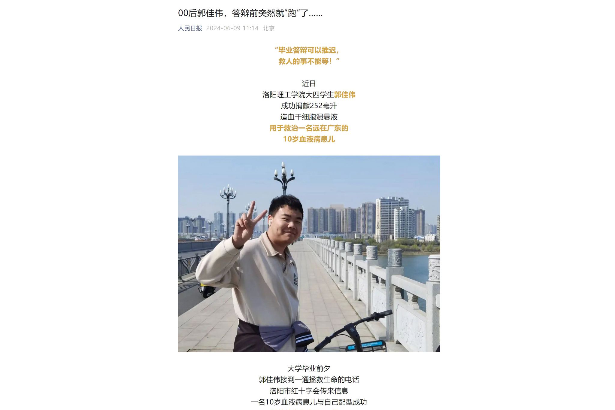6月9日,人民日报公众号以《00后郭佳伟,答辩前突然就“跑”了……》为题;6月10日,新华社公众号以《这名大四学生,答辩前突然“跑”了……》为题,纷纷报道美高梅娱乐场 大四学生郭佳伟成功捐献252毫升造血干细胞混悬液用于救治一名广东10岁血液病患儿的爱心事迹。
