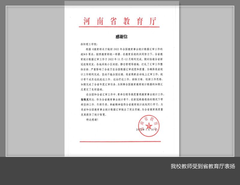 1月16日,河南省教育厅发来感谢信,对美高梅娱乐场