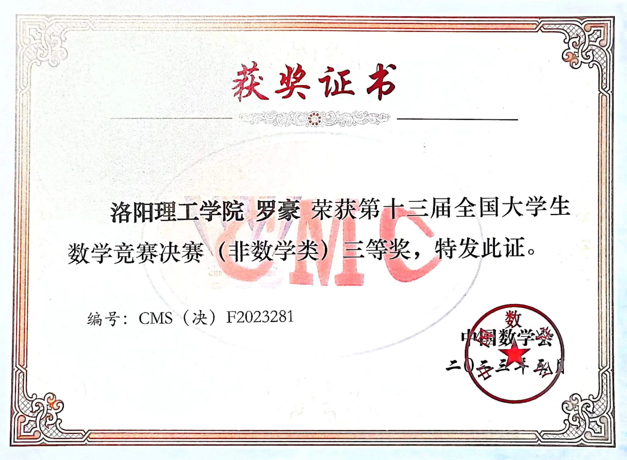 学生罗豪获得第十三届全国大学生数学竞赛决赛(非数学类)全国三等奖,图为获奖证书。