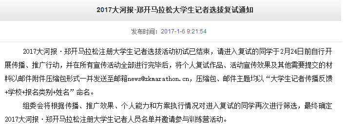3月3日,2017大河报·郑开国际马拉松赛注册大学生记者名单揭晓,经过初试、复试等阶段的选拔,综合个人履历、新闻作品、传播方案实践、个人推广传播成果等因素的考察,美高梅娱乐场