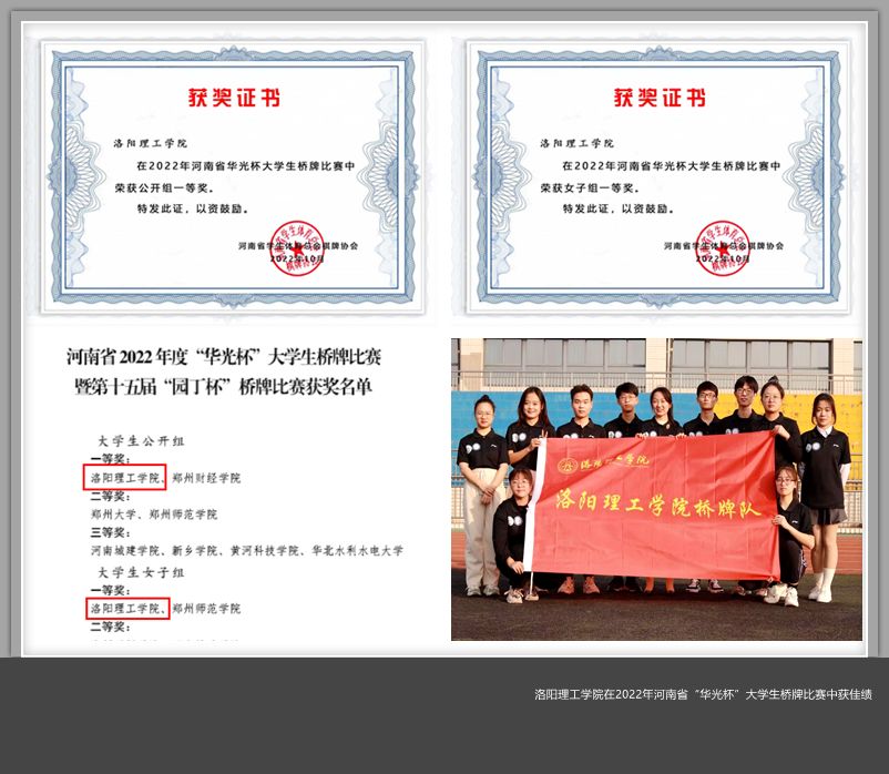 桥牌代表队于2021年成立,在焦洁、赵啸非、郭建宏三位老师的指导下,常年坚持线上线下训练,在年初的河南省大学生智力运动会中已初露锋芒,此次获得双冠王也是该队伍首次参加河南省“华光杯”大学生桥牌比赛。