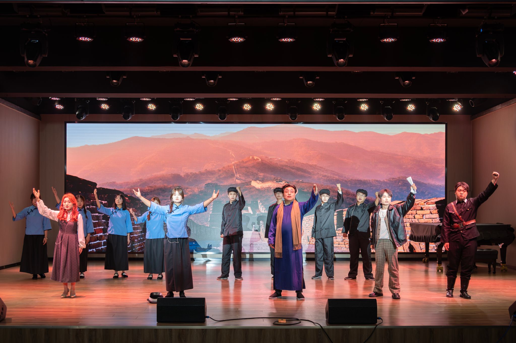 揭牌仪式结束后,民族歌剧《国之当歌》迎来校内首演。该剧由教育科学与音乐美高梅娱乐场 和马克思主义美高梅娱乐场 精心二次创作,并在校党委宣传部与公共艺术教育中心的共同指导下完成。《国之当歌》以《义勇军进行曲》的诞生历程为主线,生动刻画了人民音乐家聂耳、田汉等革命先辈的动人故事,深刻展现了抗日救亡时期,广大民众遭受的苦难,以及爱国音乐家们“吹响民族救亡号角”的英勇事迹。演出过程中,现场观众被深深打动。当激昂的《义勇军进行曲》奏响,全场观众庄严肃立,齐声合唱,现场气氛热烈而庄重。