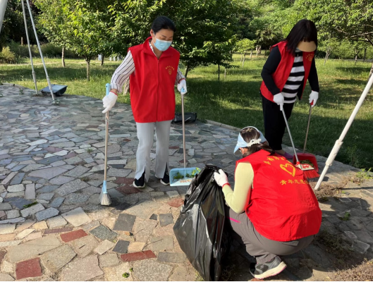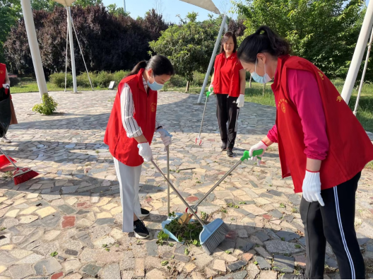 在划定的区域内,志愿者们拿起扫帚、簸箕、捡拾器等工具,或在草地间捡拾枯枝落叶,或在文化广场清理杂草,身体力行,一丝不苟。“红糖甜,白糖甜,不如劳动果实甜”,虽然顶着炎炎夏日,大家亦汗流浃背,但同时也在志愿活动中感受到劳动的快乐。