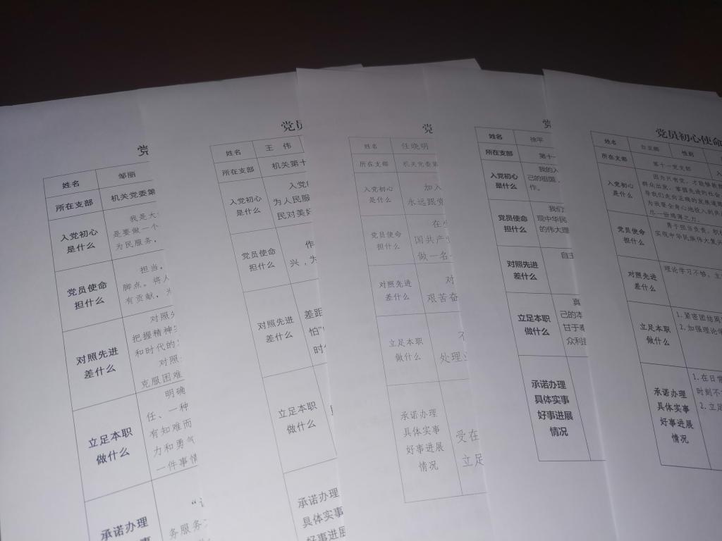 随后,全体党员紧紧围绕“守初心、担使命、找差距、抓落实”的总要求,认真对照自己和文件要求,填写《党员初心使命四问表》。