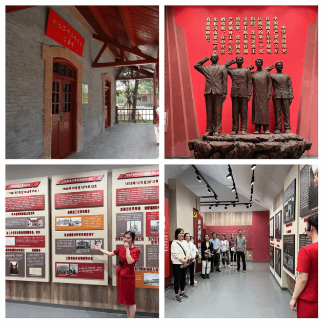 步入中共洛阳组诞生地纪念馆,党员们面向党旗,重温了入党誓词。通过讲解员的介绍,大家了解到1921年12月24日伴随着震惊中外的“陇海铁路大罢工”的胜利,在中共领导人李大钊的建议下,游天洋、白眉珊、王顺福在这里成立了河南第一个党组织——“中共洛阳组”,从此共产主义运动在中原大地上绽放出第一簇火苗。在“中共洛阳组”纪念馆,通过馆内珍藏800余幅珍贵历史图片、160余件展品、70余幅油画和多媒体展陈等大量历史实物和图片资料,大家详实学习了中国共产党成立初期河南第一个党组成立与发展的光辉历史,回顾了洛阳解放75年来社会主义建设发展取得的辉煌成就!