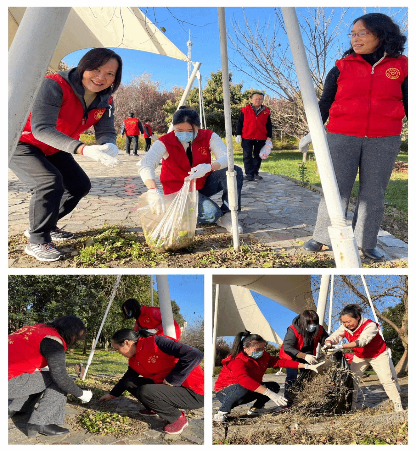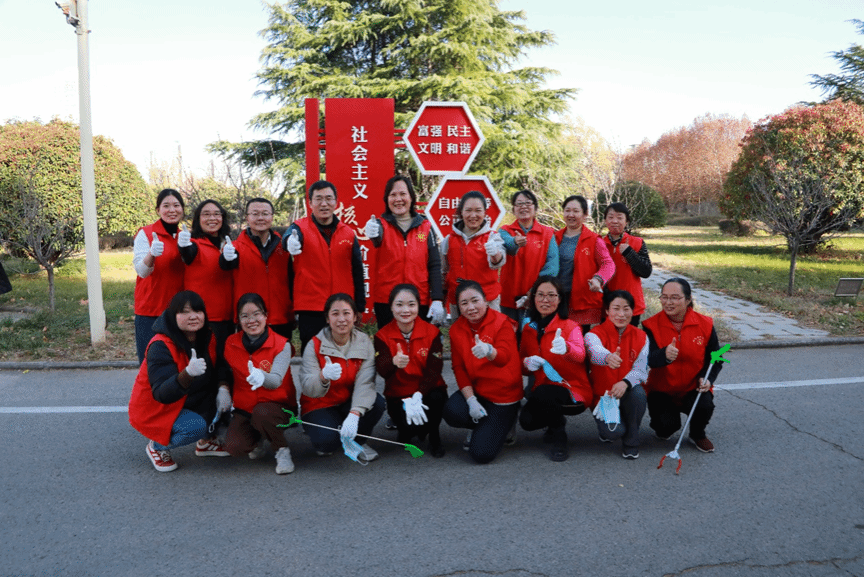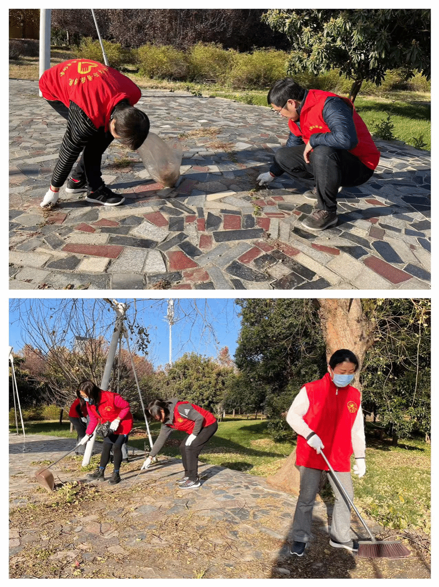 活动过程中,志愿者们纷纷拿起长夹子、扫帚、垃圾袋等劳动工具,齐心协力,分工合作。有的在草地间捡拾枯枝落叶,有的在小广场清扫杂草纸屑,经过近一个小时的辛勤劳动,草坪、花坛、文化宣传栏焕然一新。