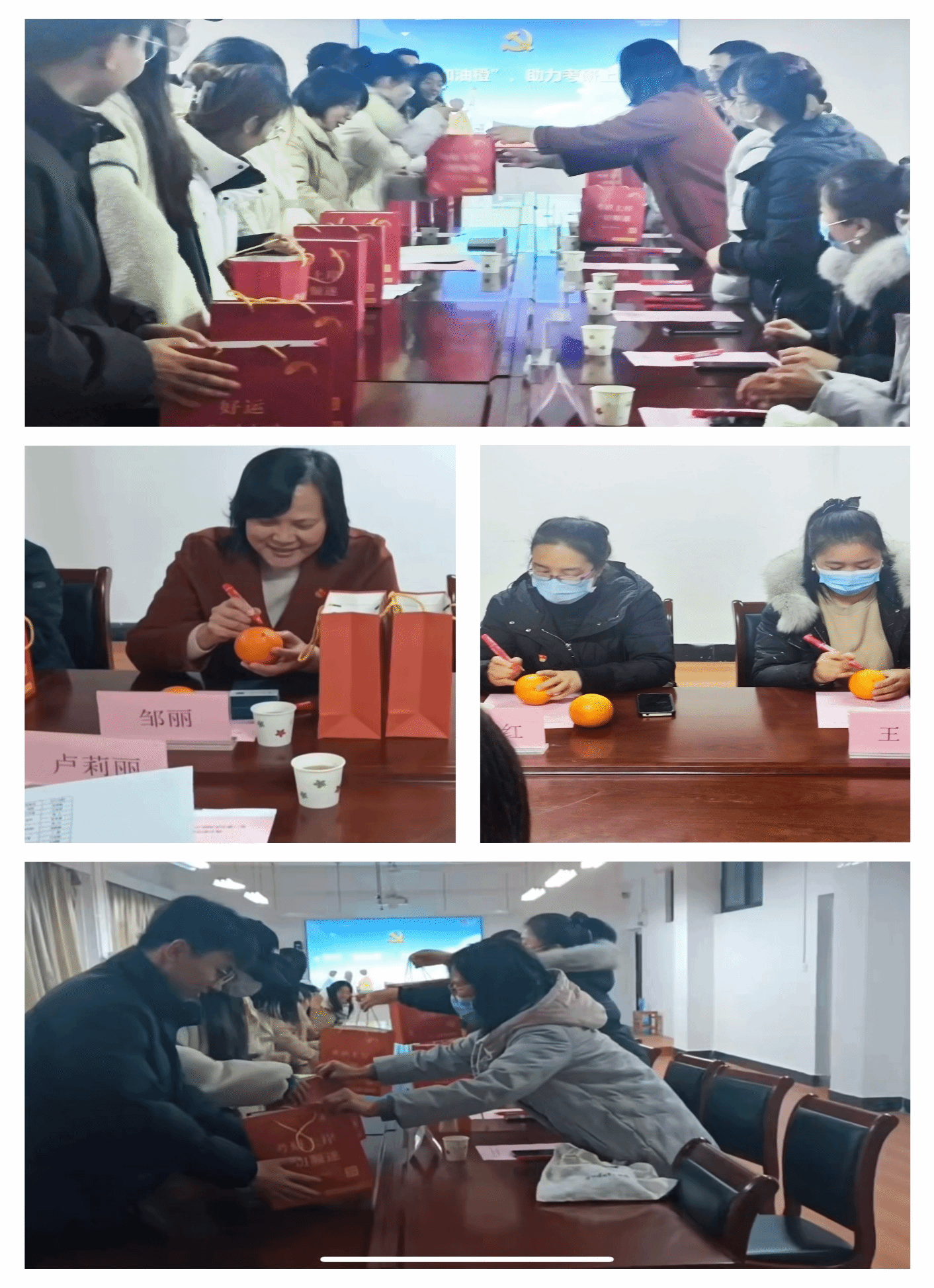 接着,机关党委第十一党支部全体党员在橙子上写下“心想事橙”“橙功上岸”“前橙似锦”等美好的祝愿,与考研定制书签一起送给了每一位考研学子。