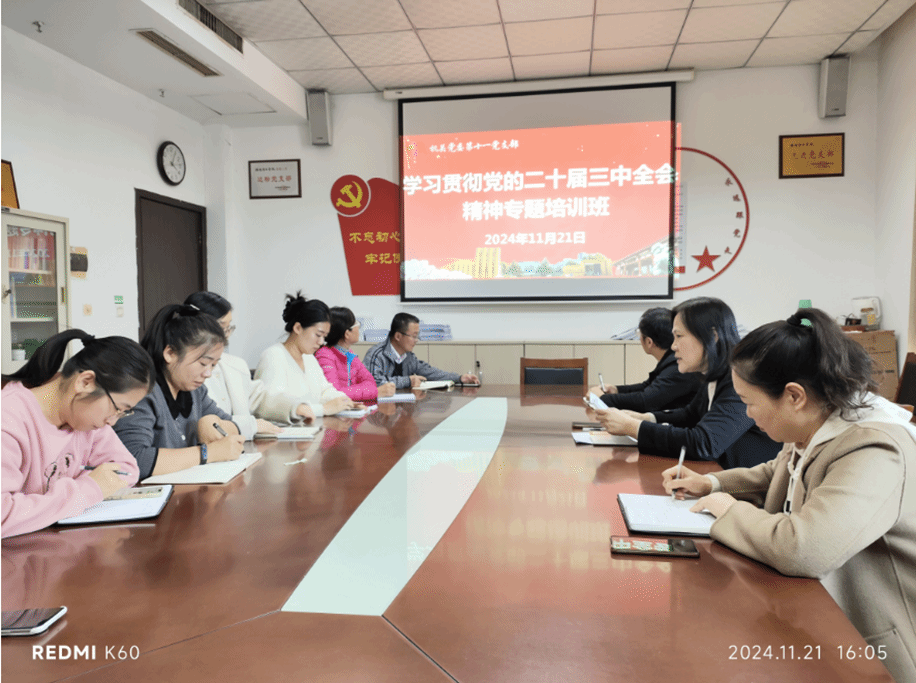 统一部署和要求,11月21日至22日,机关党委第十一党支部举办科级及以下干部、党员学习贯彻党的二十届三中全会精神专题培训班,财务处科级及以下干部、党员参加培训,党支部书记、财务处处长邹丽主持。