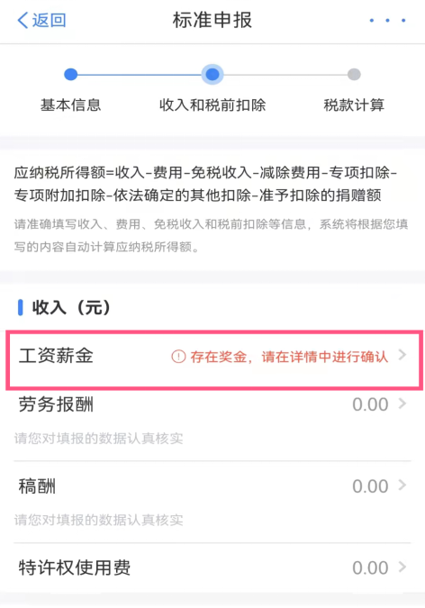 3、工资薪金--“存在奖金,请在详情中进行确认”一栏中,“全年一次性奖金”计税方式“全部并入”和“单独计税”都试一下,哪个退税多,选哪个;