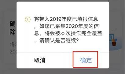 (2)系统提示“如您已经采集2020年度的信息,本次操作完全覆盖”,确认后点击“确定”。