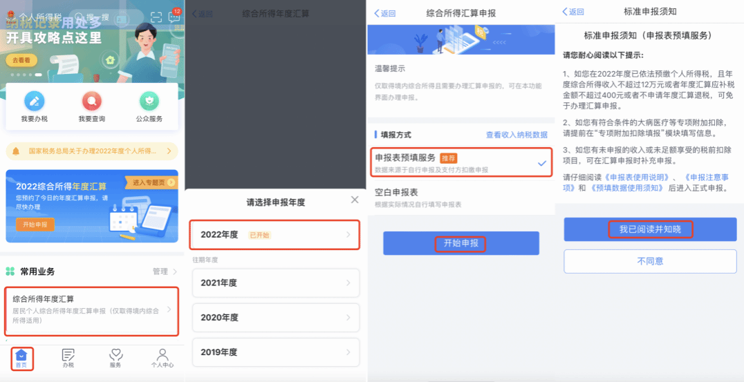 第一步:进入专题页-2022综合所得年度汇算。纳税人在个人所得税APP美高梅娱乐场点击“综合所得年度汇算”选择2022申报年度后,进入综合所得汇算页面,选择【申报表预填服务】开始申报。