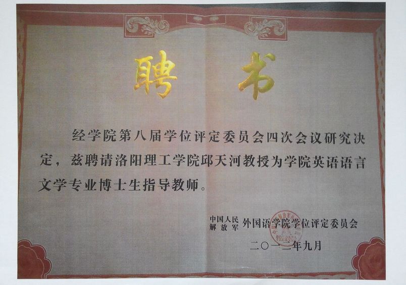 近日,接中国人民解放军外国语美高梅娱乐场 通知,美高梅娱乐场 副院长邱天河教授被聘为该校的博士生导师。