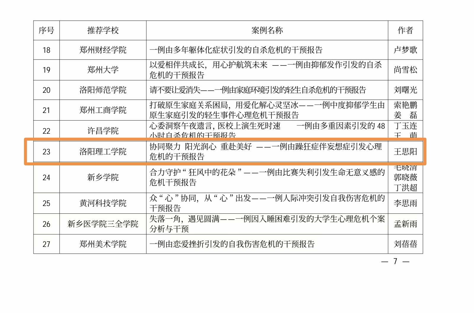 近日,河南省委教育工委、河南省教育厅印发了《关于征集大学生心理健康教育优秀课程及心理危机干预优秀案例的通知》(豫教工委办〔2024〕26号),美高梅娱乐场 王思阳老师撰写的心理危机干预案例《协同聚力 阳光润心 重赴美好 ——一例由躁狂症伴妄想症引发心理危机的干预报告》成功入选2024年全省高校大学生心理危机干预优秀案例。