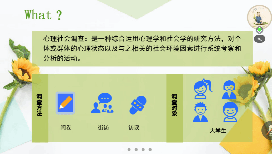 本次由杨琦琦老师和任浩琼老师分享实践教学环节中的心理团体辅导和心理社会调查两部分内容。首先,杨琦琦老师分享了人际关系团体辅导的设计方案,通过对多元排队、滚雪球、心有千千解等活动的讲解让授课老师了解活动开展的要求和启发学生讨论与思考的要点。随后,任浩琼老师分享了心理社会调查的相关内容,任老师向授课教师讲解了心理社会调查开展的流程、作业布置的要求以及学生们实施过程中的问题解决方法。分享结束后,教师们围绕这两个主题展开了分享和讨论,并结合自己的教学经验提供了实用性的意见与建议。