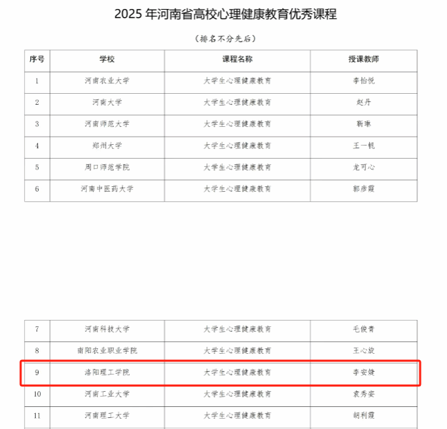 近日,中共河南省委教育工委办公室、河南省教育厅公布了《关于开展大学生心理健康教育优秀课程和工作案例征集认定活动的通知》(豫教工委办〔2025〕5 号)评选结果,美高梅娱乐场 李安婕老师申报的课程荣获 “2025年河南省高校大学生心理健康教育优秀课程”,袁孟琪、薛月琦老师撰写的案例荣获 “2025年河南省高校心理健康教育工作优秀案例”。