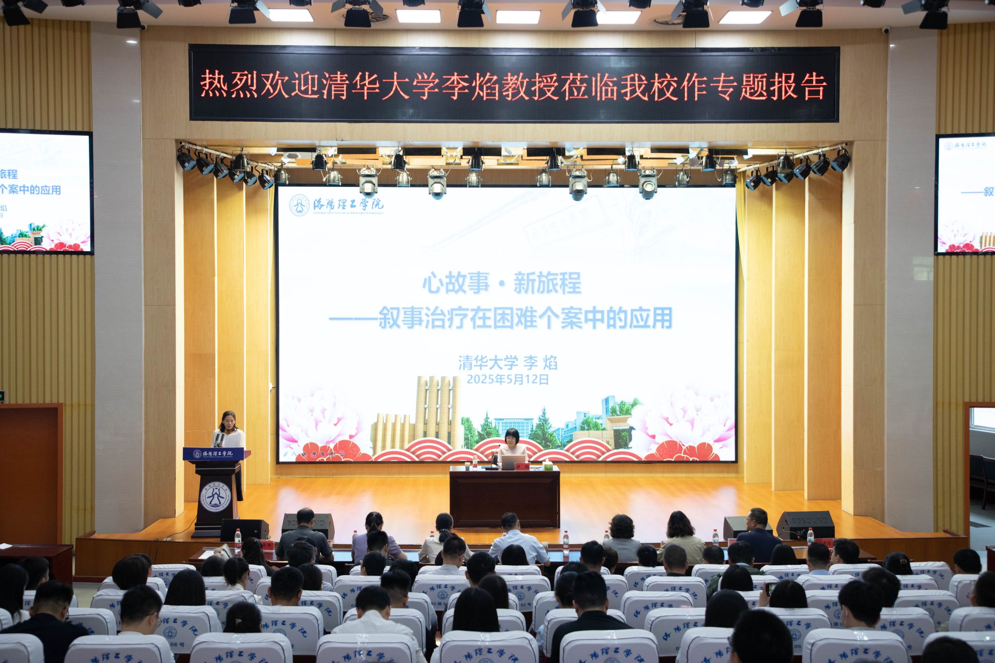 5月12日上午,清华大学学生心理发展指导中心首席专家李焰教授受邀在美高梅娱乐场 王城校区图书信息中心报告厅作题为《心故事·新形势——叙事疗法在理解高校困难个案的运用》专题报告。党委副书记胡恩立,学生工作处、校工会、校团委、马克思主义美高梅娱乐场 、心理健康教育中心、各一站式学生社区负责人,各二级美高梅娱乐场 党委副书记、全体辅导员、班主任和女工委员代表参加此次报告会。
