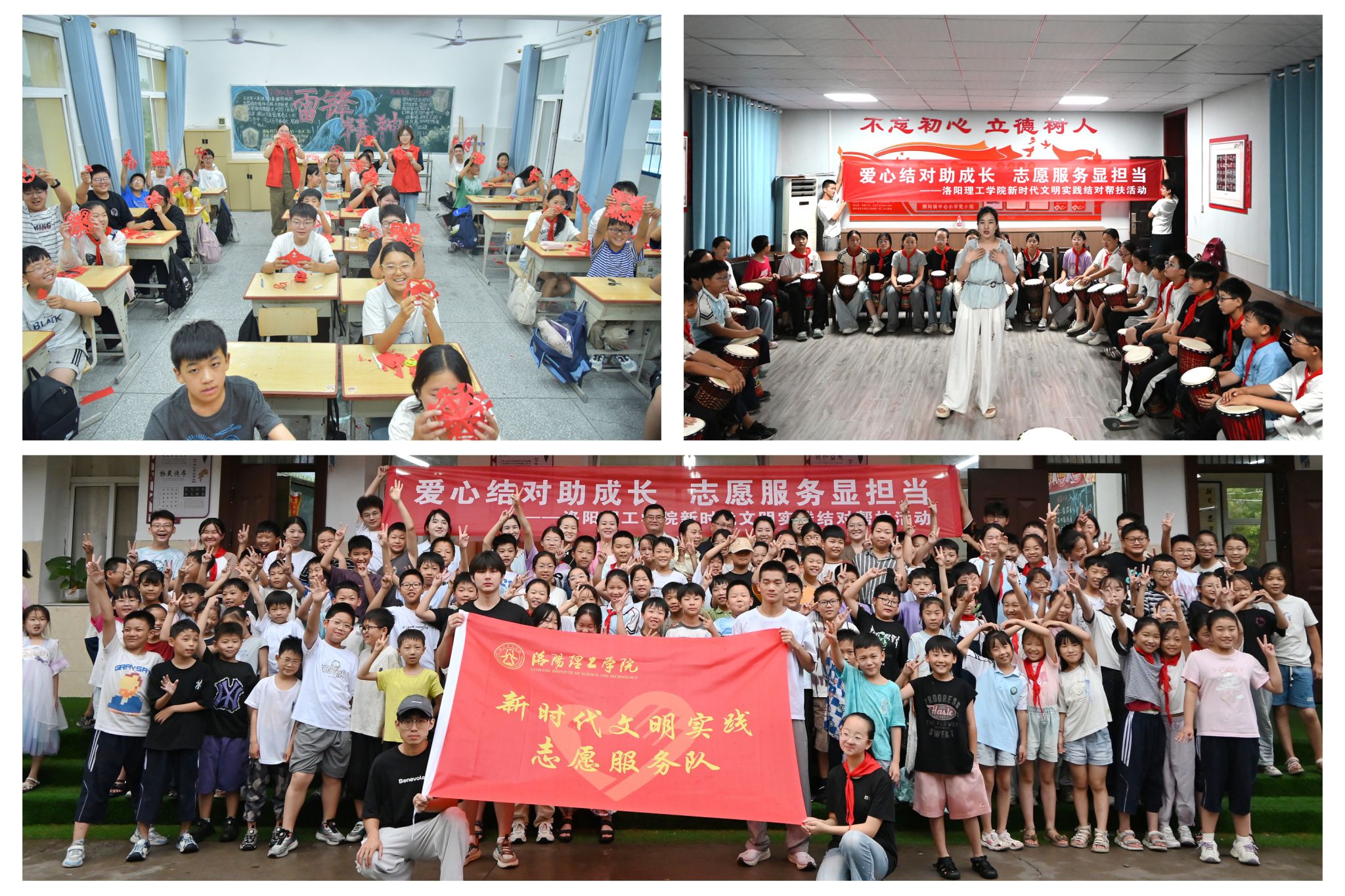 为深化新时代文明实践,助力乡村儿童健康成长,鼓励引导广大师生积极投身文明实践志愿服务,6月18日,美高梅娱乐场 新时代文明实践志愿服务队走进孟津区朝阳镇中心小学开展“爱心结对助成长 志愿服务显担当”结对帮扶活动。党委宣传部、心理健康教育中心、艺术设计与服装美高梅娱乐场 和人工智能美高梅娱乐场 20余名师生志愿者参加活动。