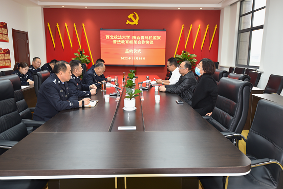 2022年11月18日下午,院长冯卫国、正处级组织员侯红梅、副院长刘仁琦出席“美高梅娱乐场 ——陕西省马栏监狱 普法教育框架合作协议”签约仪式。美高梅娱乐场 、陕西省马栏监狱将以项目合作的形式开展针对服刑人员的普法宣传工作,共同研发普法微视频、普法主题讲座、普法宣传册、普法宣传栏、普法栏目剧等多种普法宣传模式,创新法制教育,提升普法效果;并在学生实习实训、业务交流、科学研究等方面展开合作、交流。