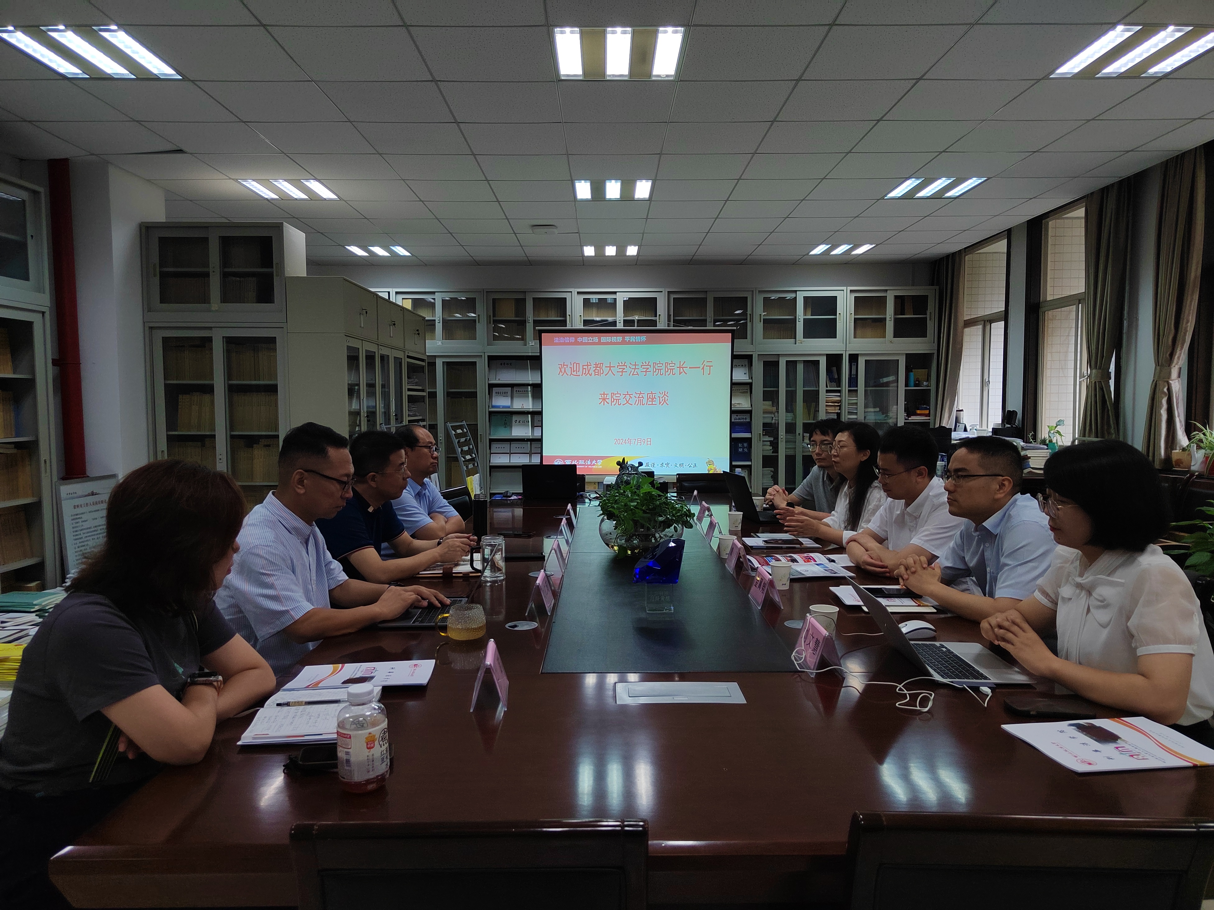2024年7月9日上午,成都大学法美高梅娱乐场 邓陕峡院长一行到访美高梅娱乐场 ,就学科建设、科学研究、教学实践、学生就业等工作交流座谈。本次座谈由美高梅娱乐场 副院长刘仁琦主持。