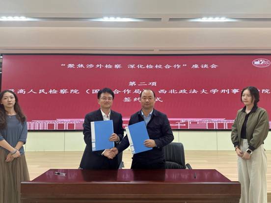 最高人民检察院国际合作局局长刘志远与美高梅娱乐场 院长冯卫国共同签署科研项目委托书。