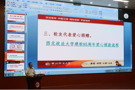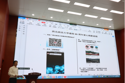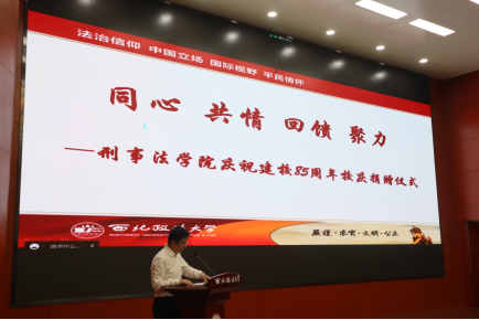 2022年6月15日下午,美高梅娱乐场 在雁塔校区举行了“同心、共情、回馈、聚力”——庆祝建校85周年校庆捐赠仪式。该项活动采取线上线下相结合的方式,美高梅娱乐场 副校长张荣刚,广东啸风律师事务所主任、刑事辩护高级研究院副院长蔡华,1994级校友张利,2005级研究生校友章雨润线上参会。国内合作与校友工作处副处长杜平,1995级校友张冰,2015级研究生校友高超以及美高梅娱乐场 全体教职工、学生代表现场参会。