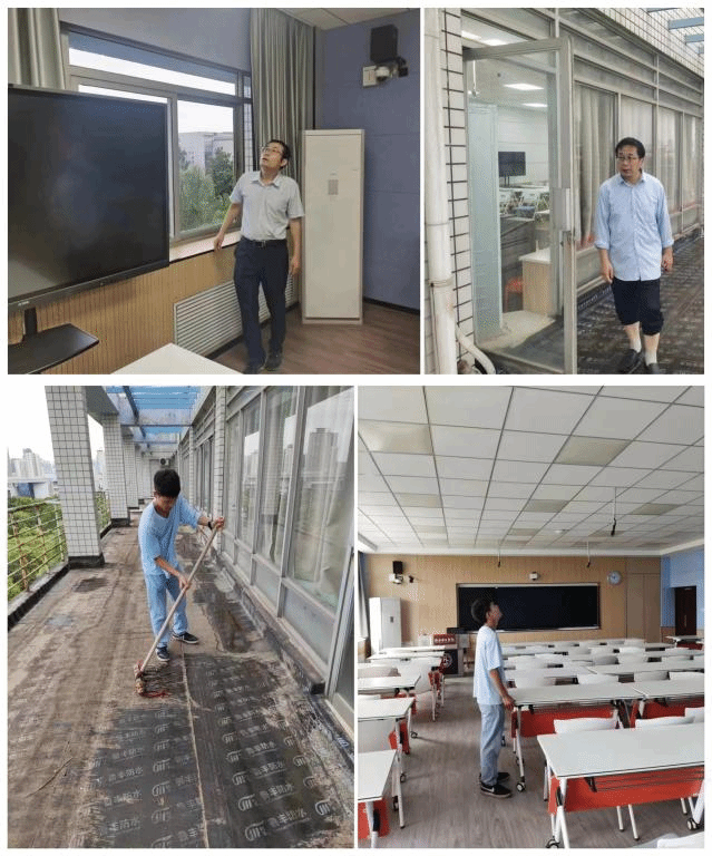 2. 每逢大雨倾盆之际,信息人都在担忧智慧教室设备安全问题,暑假冒雨多次排查三个校区近100间智慧教室漏雨等情况,为问题教室设备及时做好防护,报备维修。