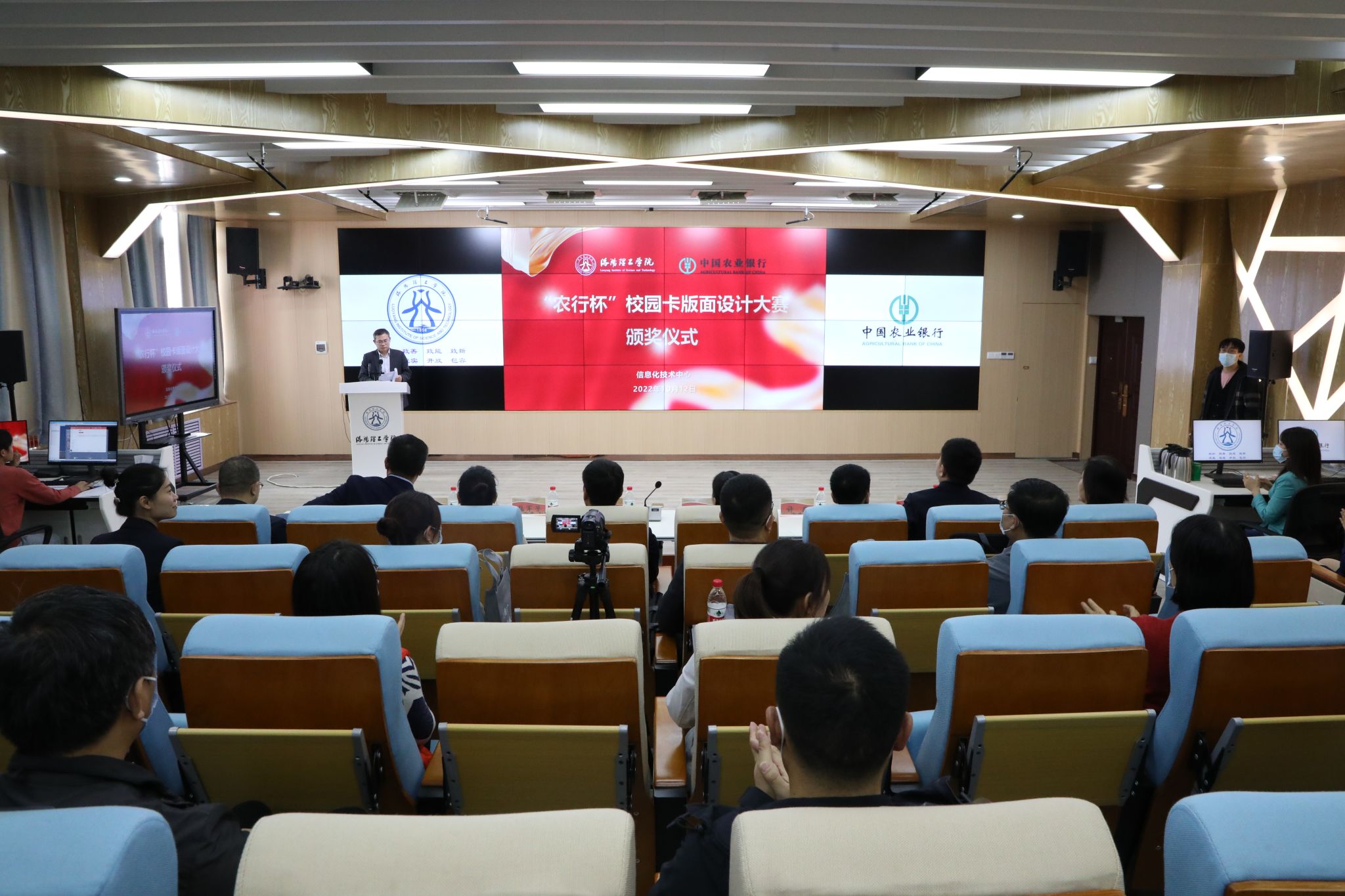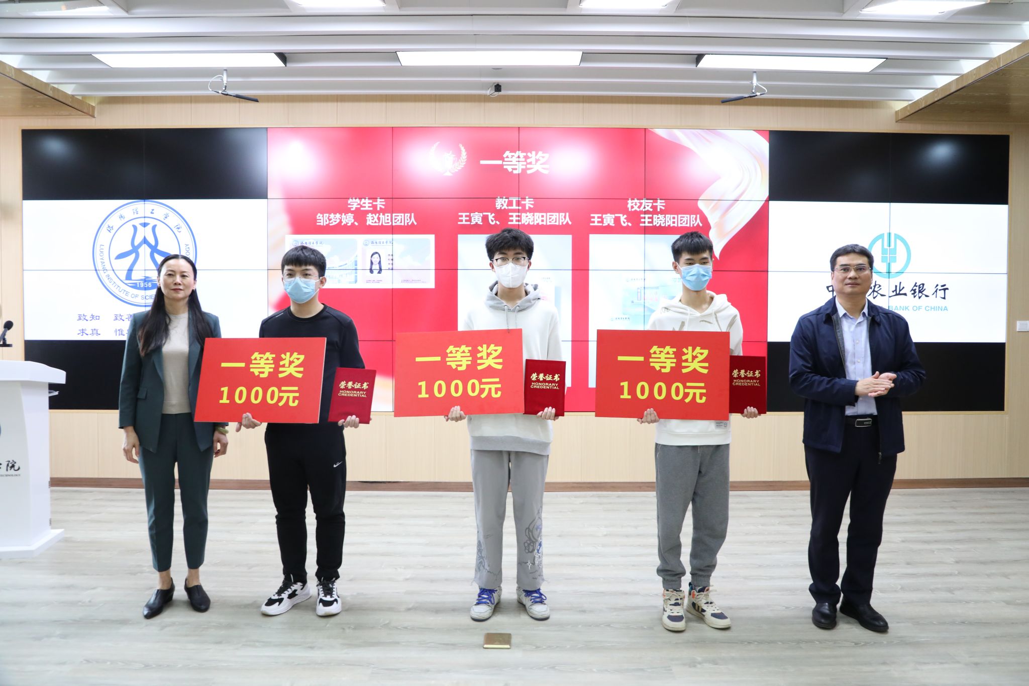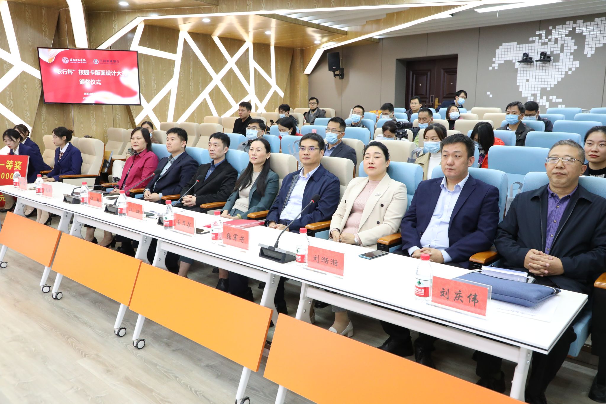 “农行杯”校园卡版面设计大赛颁奖仪式在王城校区智慧教学可视化管理中心举行。副校长马珺、中国农业银行洛阳分行副行长王彦武、机构部总经理许巍、洛阳新区支行行长张军芳、副行长王恩泽、行长助理郝捷等嘉宾出席会议,学生处、财务处、后勤管理处、校团委、信息化技术中心等部门负责人、教美高梅娱乐场