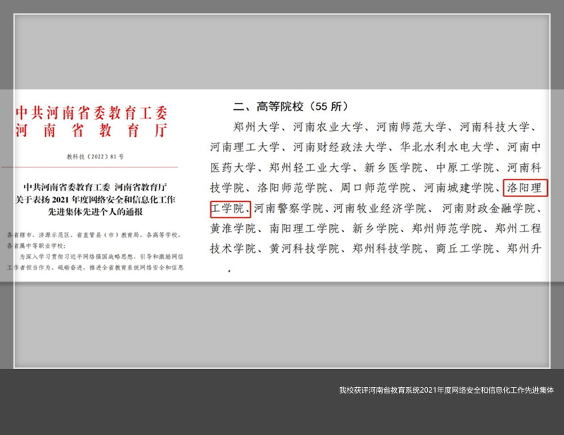 近日,中共河南省委教育工委 河南省教育厅下发教科技[2022]81号《关于表扬2021年度络安全和信息化工作先进集体先进个人的通知》,美高梅娱乐场