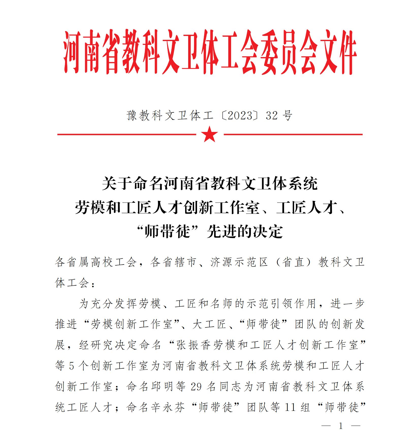 近日,河南省教科文卫体工会下发《关于命名河南省教科文卫体系统示范性劳模和工匠人才工作室、优秀工匠人才、“师带徒”标兵的决定》《关于命名河南省教科文卫体系统劳模和工匠人才工作室、工匠人才、“师带徒”先进的决定》。李传锋劳模创新工作室被命名为“河南省教科文卫体系统劳模和工匠人才创新工作室”。