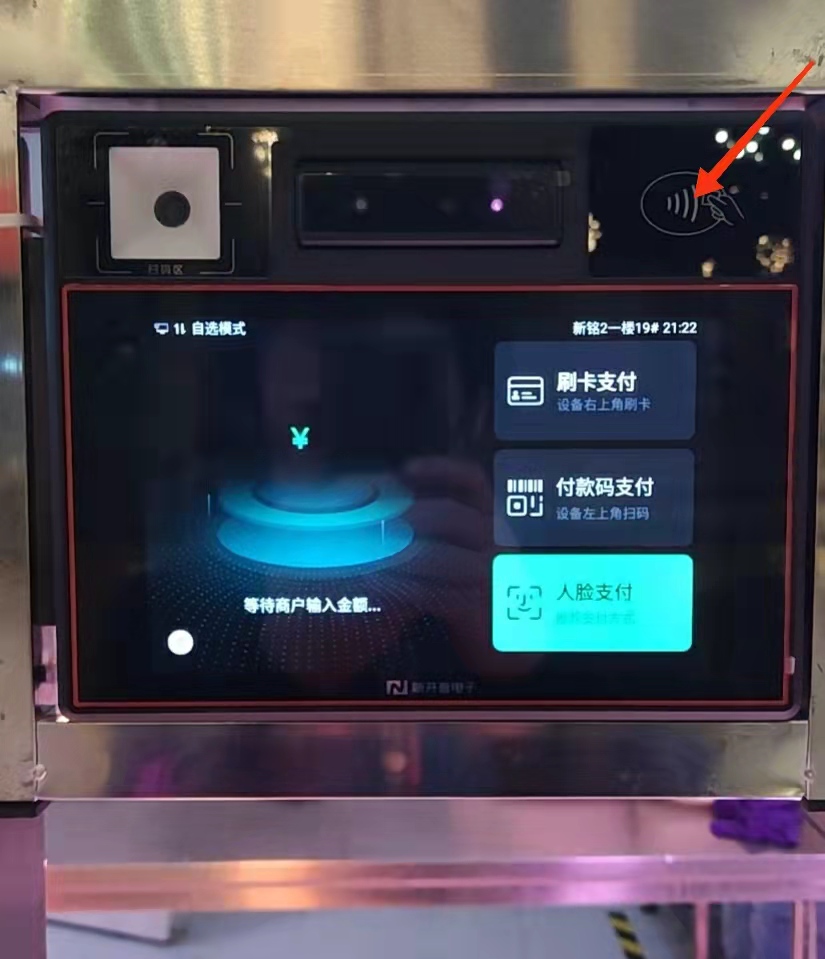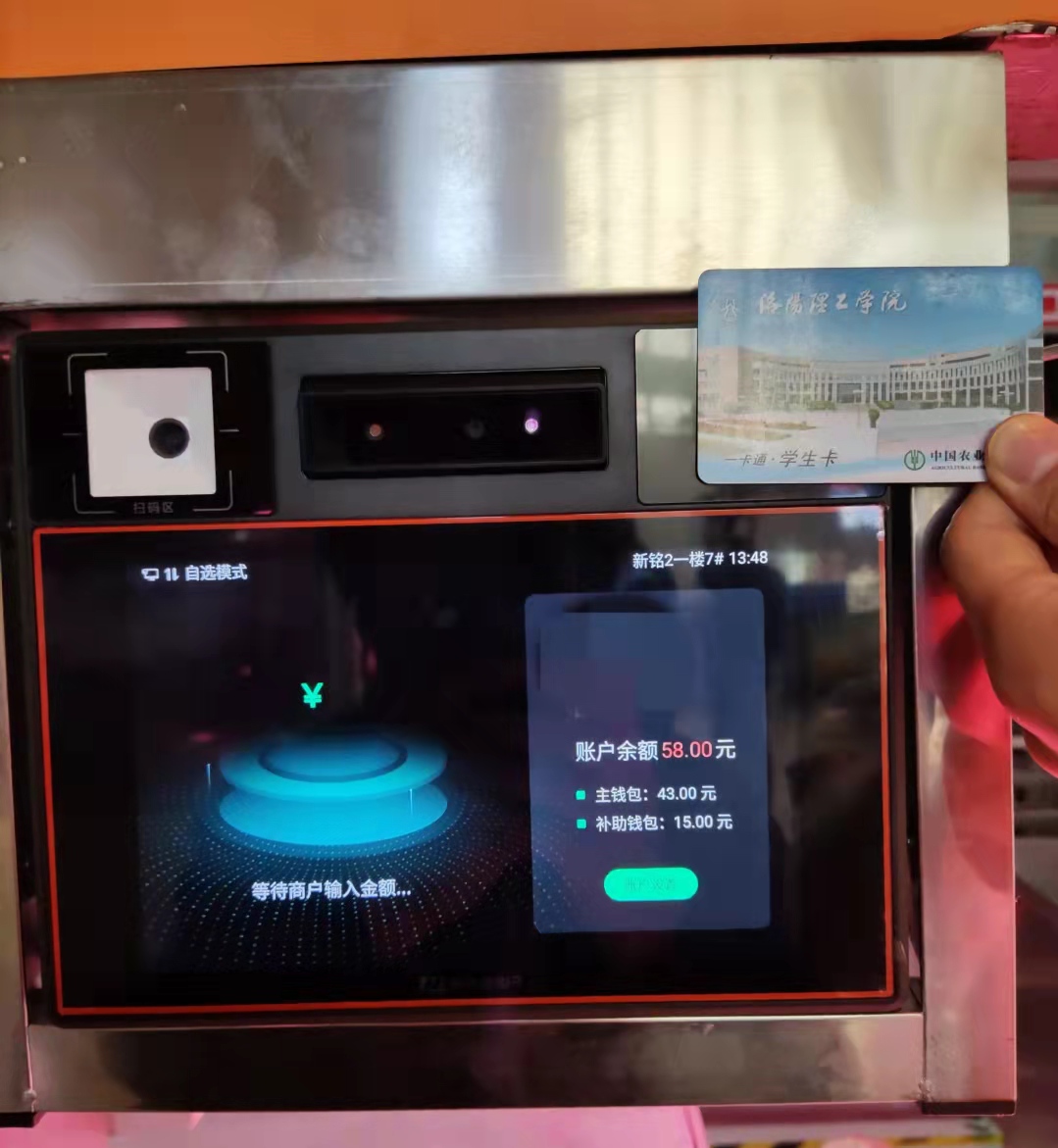 如果在校内各个餐厅使用校园卡在刷卡机(如下图所示)刷卡消费,则消费扣款的同时开水补助领款完成,屏幕上显示“补助钱包:15.00元”。