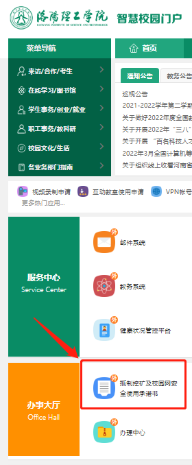 方法二:打开校园网主页:meigaomeient.com,点击右上角“智慧校园门户”,输入账号密码登录后,在美高梅娱乐场“办事大厅”处,点击“抵制挖矿及校园网安全使用承诺书”,进入后,认真阅读所有条款,输入承诺人姓名及上网账号(手机号),点击“同意,提交”即可。