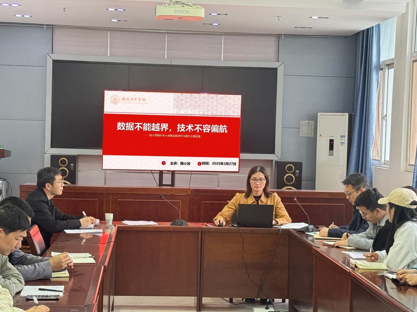 随后,以《数据不能越界,技术不容偏航》为题,韩书记给全体教职工上了一堂生动的主题党课,带领大家学习了中央八项规定制定历程、精神内核以及违反中央八项规定精神问题的具体表现。结合中心工作特点,分析指出在信息化项目建设、运维、服务以及日常管理中可能存在的风险点,希望各科室从加强制度建设、强化监督机制、提升廉洁意识、规范数据管理、优化服务流程等方面,谋划制定切实可行的风险防范措施。