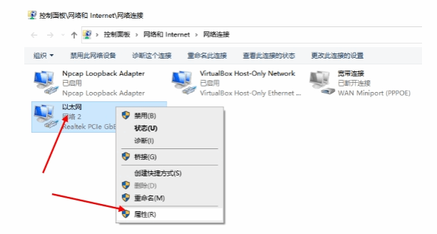 3. 在“以太网”图标上点右键—点击“属性”。