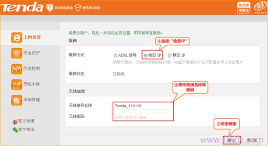 2、登陆之后点击“上网设置”——>“联网方式”选择:动态IP——>设置“无线信号名称”、“无线密码”——>点击“确定”。