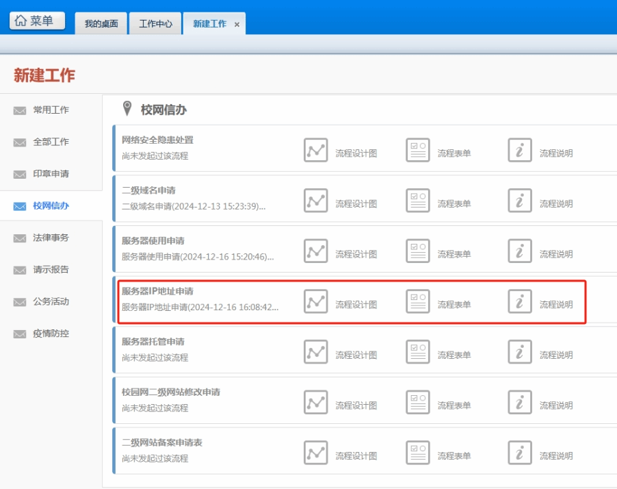 OA系统申请实施,OA系统位置:菜单->工作流->新建工作->校网信办->选择“服务器