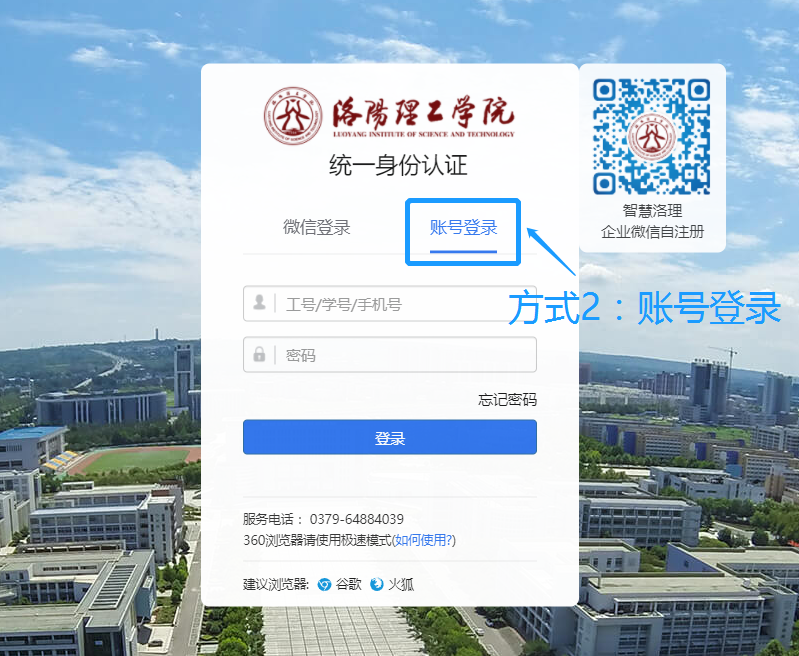 (1)方式1(微信登陆):首次使用将个人的工号/学号、密码绑定至个人微信,以后即可扫码登录。此种方式安全性和便捷性更高,推荐使用。