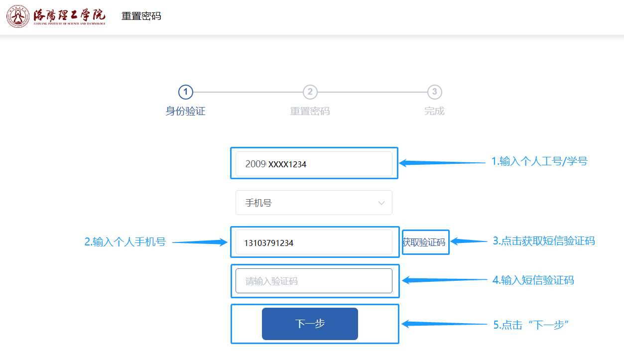 信息化技术中心已将美高梅娱乐场 师生员工手机号导入平台,只需点击“忘记密码”填写手机号,即可重置密码。