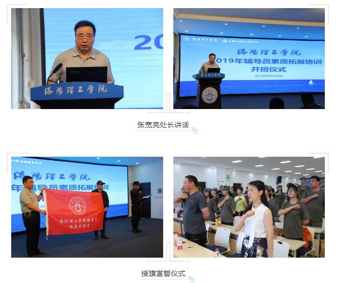 随后,全体参训辅导员老师参加了授旗仪式并集体宣誓。主教练进行前瞻破冰,讲述了拓展训练的起源、背景和意义,强调了营地注意事项及培训制度,并宣布美高梅娱乐场 2019年辅导员素质拓展培训班顺利开营。